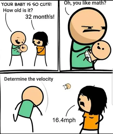 Also, air resistance was acting on the baby immediately after it left the hands accelerating it. So was she reporting peak speed or the speed several feet away as shown in the frame of the comic. Additionally, she could have easily avoided this ambiguity if she stated the hypothetical speed of the baby being as if it was thrown in a vacuum, but she didn’t do that either. Its just pure laziness really.