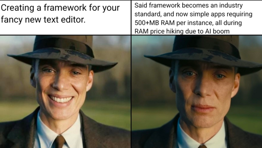 arrow-up1667arrow-down1imageElectron appslemmy.worldZILtoid1991@lemmy.world to Programmer Humor@programming.dev · 1 month agomessage-square142linkfedilink