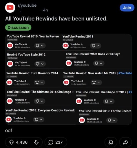 arrow-up1501arrow-down1imageApparently, all YouTube Rewinds have been unlisted as of today.lemmy.worldvcokltfre@lemmy.world to Mildly Infuriating@lemmy.worldEnglish · 2 months agomessage-square77linkfedilink