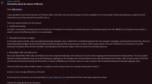 Rising RAM, SSD, and HDD prices Since last September, RAM, SSD, and HDD prices have surged dramatically and continue to rise due to the ongoing extreme demand for AI datacenters. This has caused Myrient’s hosting expenses to go up as well. Necessary upgrades to the storage and caching infrastructure only exacerbated the problem. With a large number of servers and the aforementioned existing monthly deficit in excess of $6000 out of pocket, there is no way to pay for the increased hosting and hardware upgrade costs.
