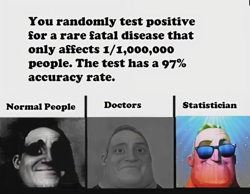 What statistician is this referring to? Certainly not one who understands probabilities. The first number has nothing to do with it. You tested positive, and there’s only a 3% chance that result is wrong. Time to settle your affairs.