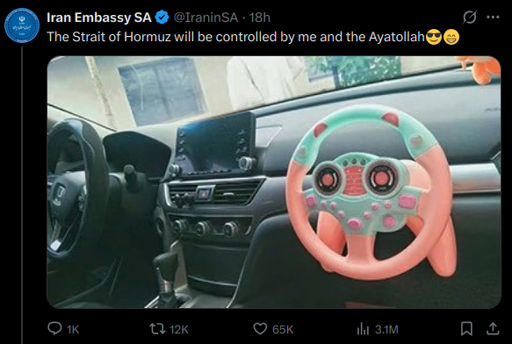 Trump said the waterway through which 20 percent of global energy supplies pass will be “jointly controlled. Maybe [by] me. Maybe me. Me and the Ayatollah, whoever the Ayatollah is”,